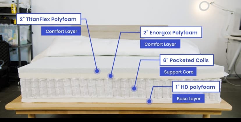 - What it’s Made of: Polyfoam comfort layers over a support core of pocketed coils.