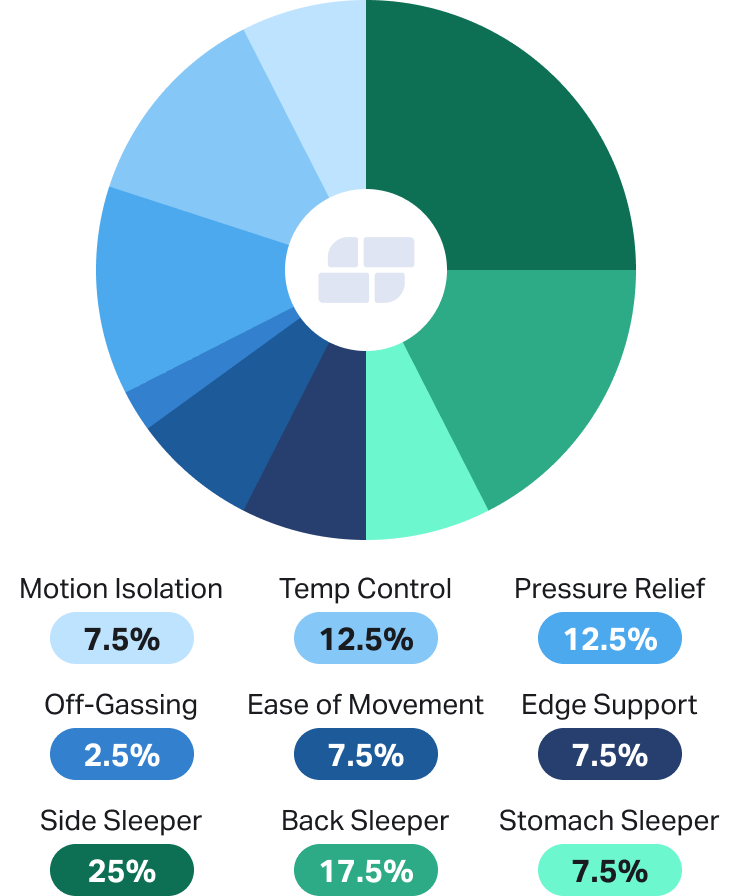 To determine a mattress’s overall score, we assign weighted percentages to performance categories based on how important they are to the individual sleep experience. For instance, areas like pressure relief and temperature control tend to matter more to people than something like off-gassing, and because more people sleep on their side and back than on their stomach, we weigh those positions more heavily